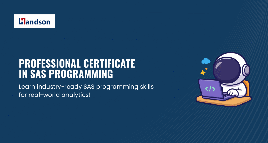 The Professional Certificate in SAS Programming is an intensive 8-week (48-hour) live online training program designed to help learners master SAS — the global leader in analytics and enterprise-grade statistical analysis. This industry-aligned certification program by Handson System trains you in the complete SAS ecosystem, from data import and manipulation to reporting, visualization, data transformation, and scalable programming techniques.